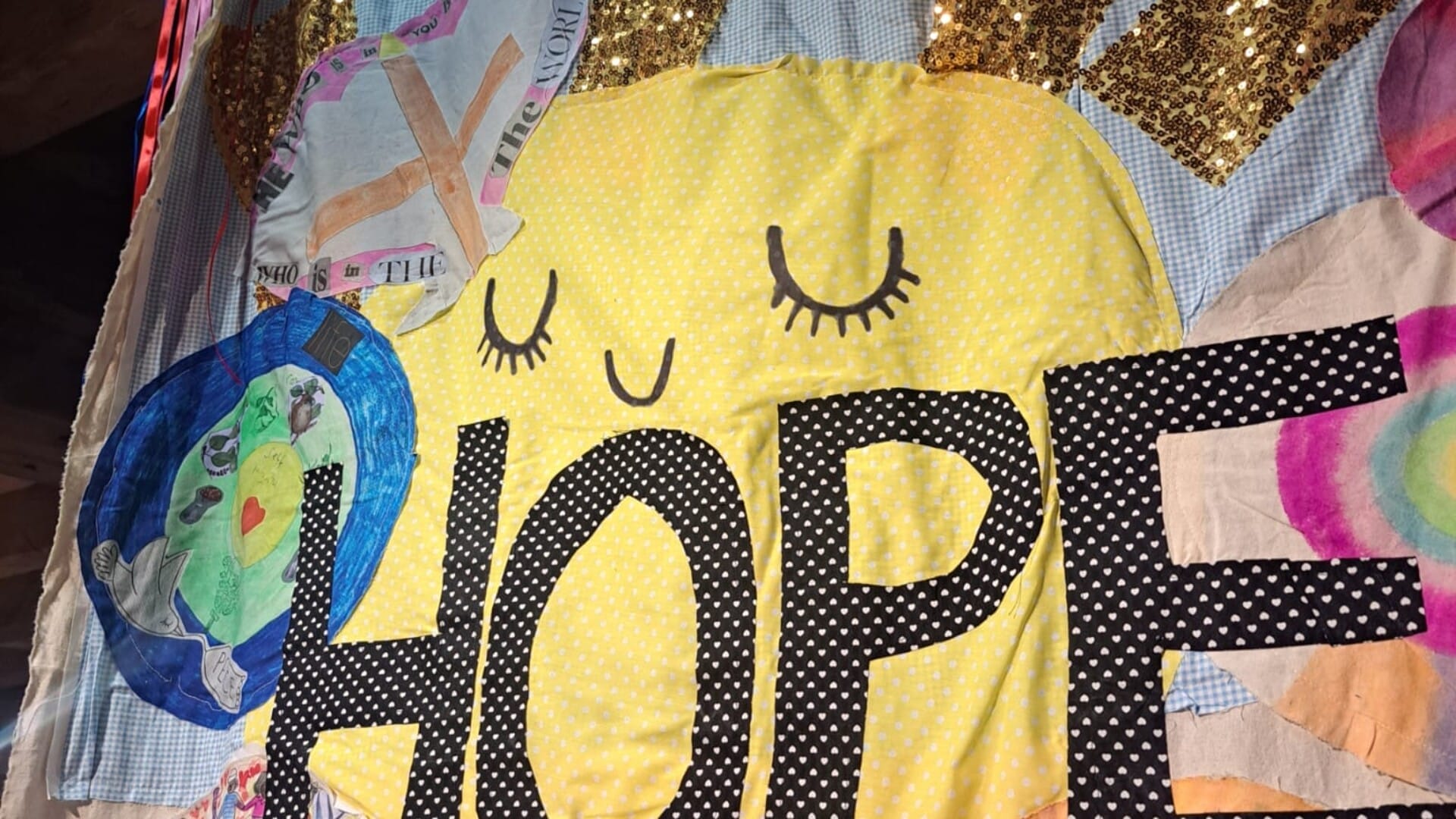 This October Chatty Craft created an Exhibition on the theme EXTREME HOPE, displayed at the Museum of Science and Industry. Alongside lanterns of hope, they made a banner which reads: HANDS HOLDING HOPE AROUND A BIG BEAUTIFUL WORLD. The Exhibition is now on permeant display at Beswick Library.